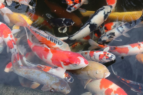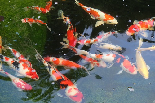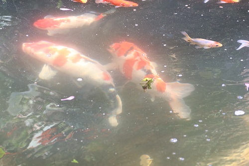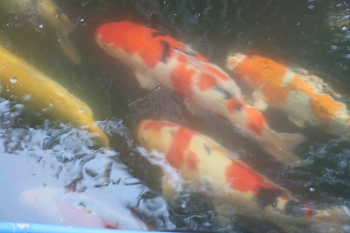 池の水は少し濁っているが鯉は元気に泳ぎ回っている。