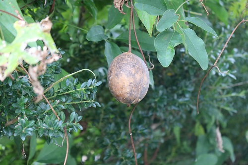 熟し過ぎた「キカラスウリ」と季節外れの花は?