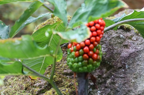 「マムシグサ」も赤く変身すると綺麗だ。都会で飼っていた許可のいらない、