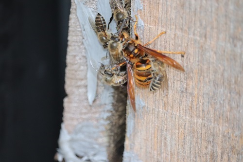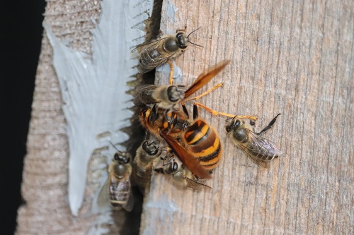 命がけで黄色スズメバチが日本ミツバチを捕獲しに来ています。